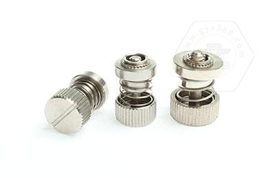 手緊螺釘?shù)膲恒T套具有壓花齒,壓裝于于機箱或薄鈑孔內(nèi)(注:薄板的鉆孔徑相對應(yīng)彈簧螺釘?shù)膲糊X徑有一定要求的,形成一個外露的彈簧螺釘,用手?jǐn)Q另一端(即手?jǐn)Q端).因其里面固定有彈簧,螺釘相對于薄板的另一端來回進出。