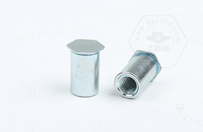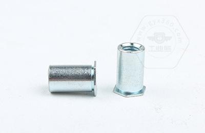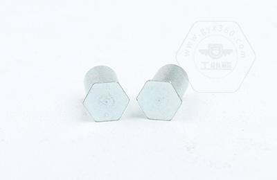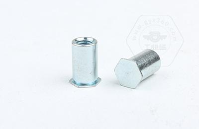 通過壓力機將六角頭壓入薄板的預(yù)置孔內(nèi)(預(yù)置孔的孔徑一般略大于壓鉚螺柱的圓柱外徑)使孔的周邊產(chǎn)生塑性變形,變形部分被擠入壓鉚螺母柱的退刀槽內(nèi),使壓鉚螺母柱鉚緊于薄板上,從而在薄板上形成一下有效固定的內(nèi)螺紋。