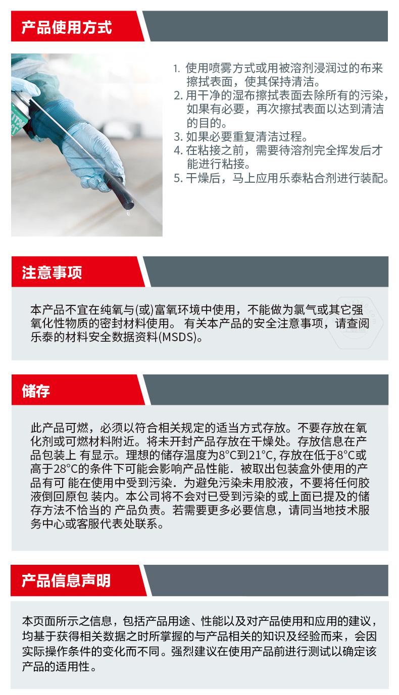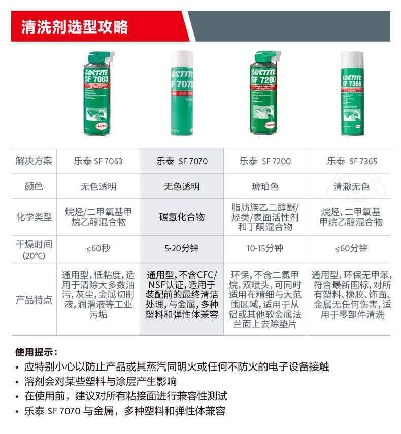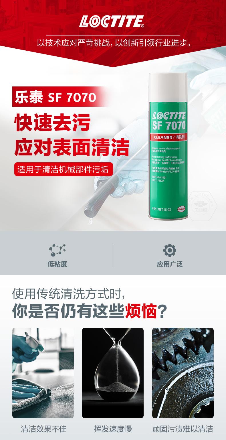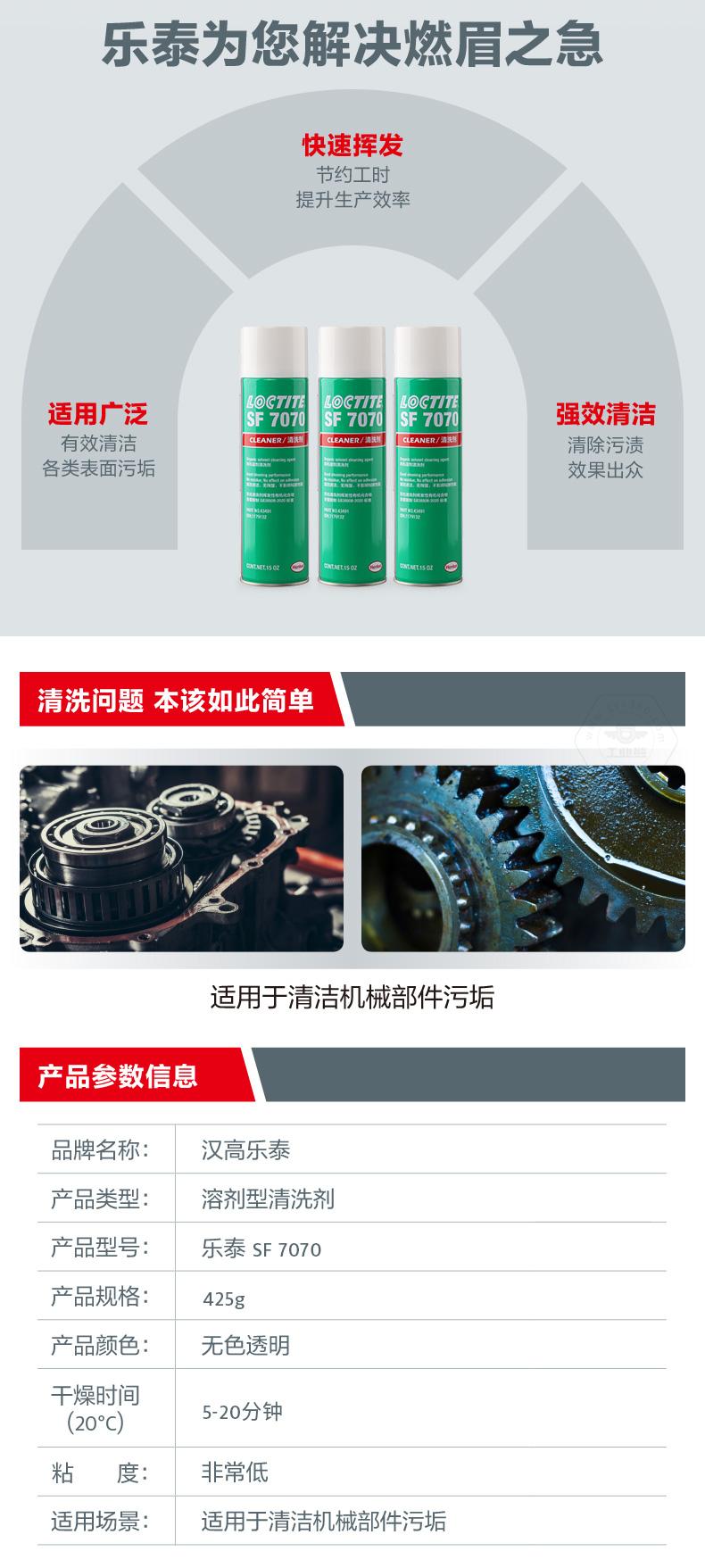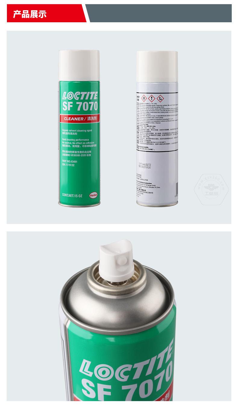 樂泰SF7070是一種無色透明溶劑型(不含氟氯烴的)部件清洗劑和脫脂劑,它經過特別配制,可使部件與膠粘劑粘合。該產品適合在室溫下用做噴劑,能去除部件上的大部分油、油脂、潤滑液、金屬切削液和細粉,可安全用于鋁、橡膠和大多數(shù)塑料。
