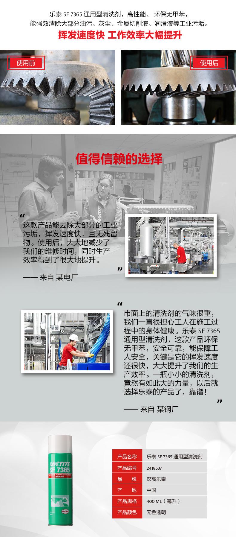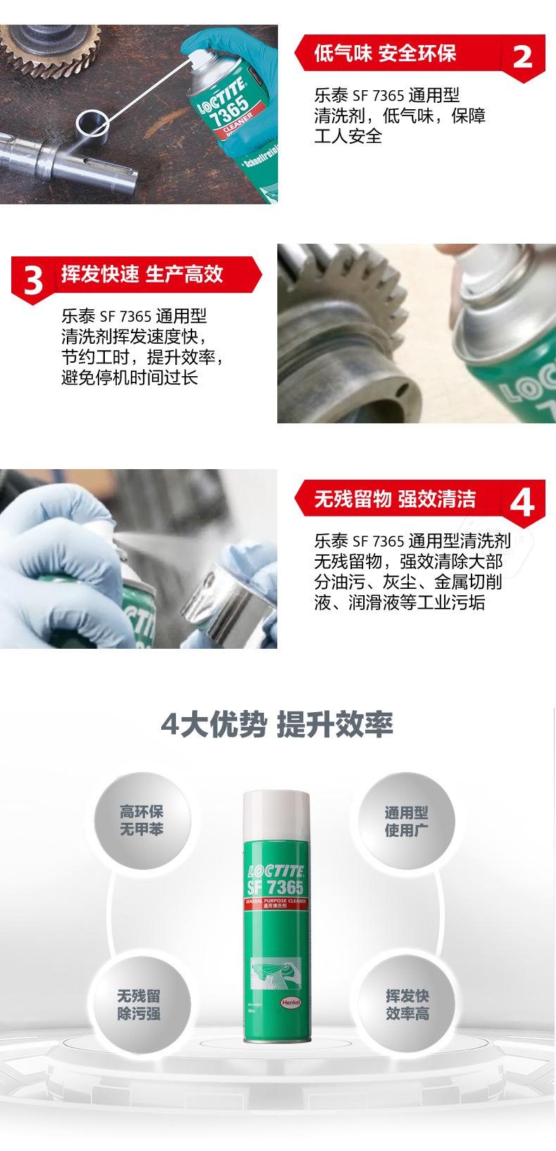 樂泰SF7365通用型清洗劑是一款高性能、環(huán)保無甲苯的零部件清洗劑。樂泰SF7365通用型清洗劑低氣味,使用更安全;樂泰SF7365通用型清洗劑揮發(fā)快,可節(jié)約工時、提升效率。對于油污、灰塵、金屬切削液、潤滑液等工業(yè)污垢,樂泰SF7365通用型清洗劑可實(shí)現(xiàn)無殘留強(qiáng)效清潔,適用范圍覆蓋電廠、礦場、石化、鋼鐵、紡織、水處理、造紙和食品加工行業(yè)。